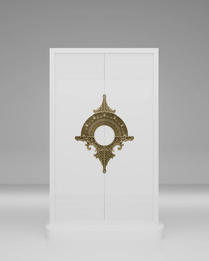 A luxurious white main door featuring a handcrafted brass Mandala inlay with ornamental borders — designed to create a grand and divine first impression.