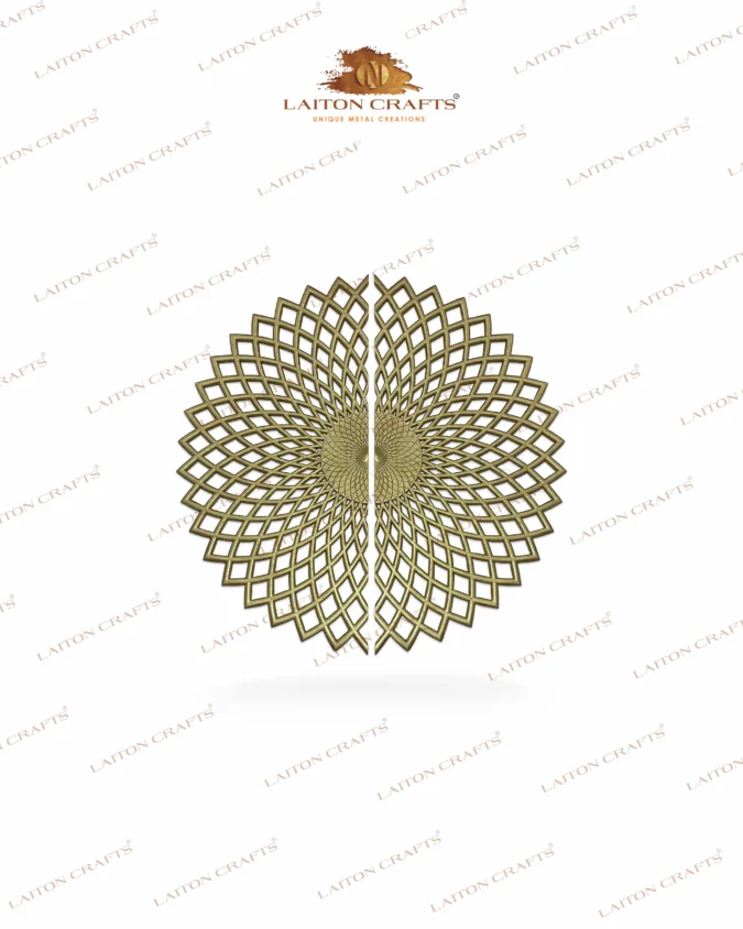 A striking geometric mandala centerpiece crafted in premium solid brass to redefine luxury entrances. The radiating pattern symbolizes harmony, balance, and positive energy — making every doorway feel prestigious and inviting.