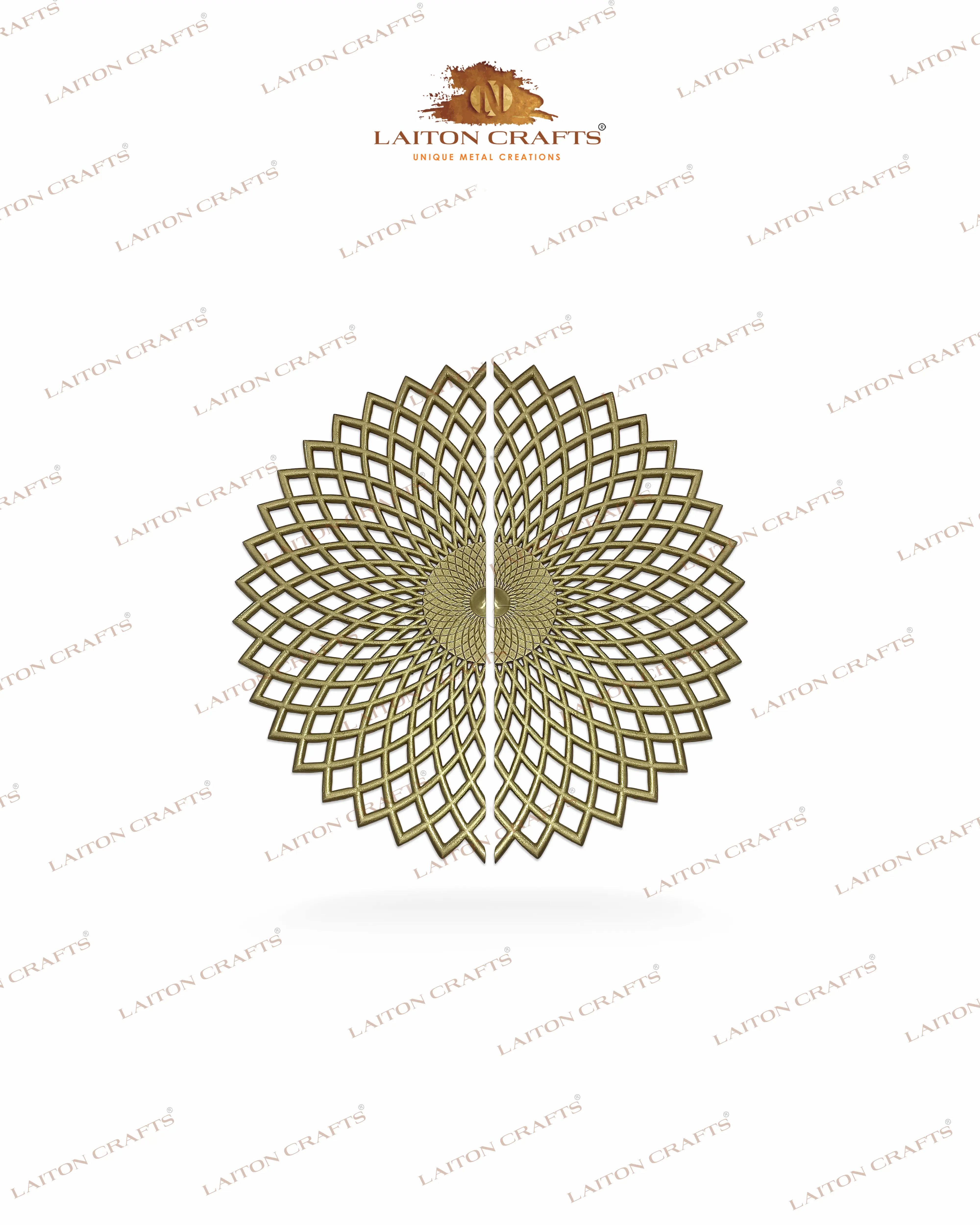 This elegant mandala-inspired design from Laiton Crafts showcases a perfectly engineered geometric pattern that expands outward from the center, creating an eye-catching focal point for double doors. Crafted in solid brass, it features precisely handcrafted symmetry, offering a seamless alignment when doors are closed and an artistic presence when open.