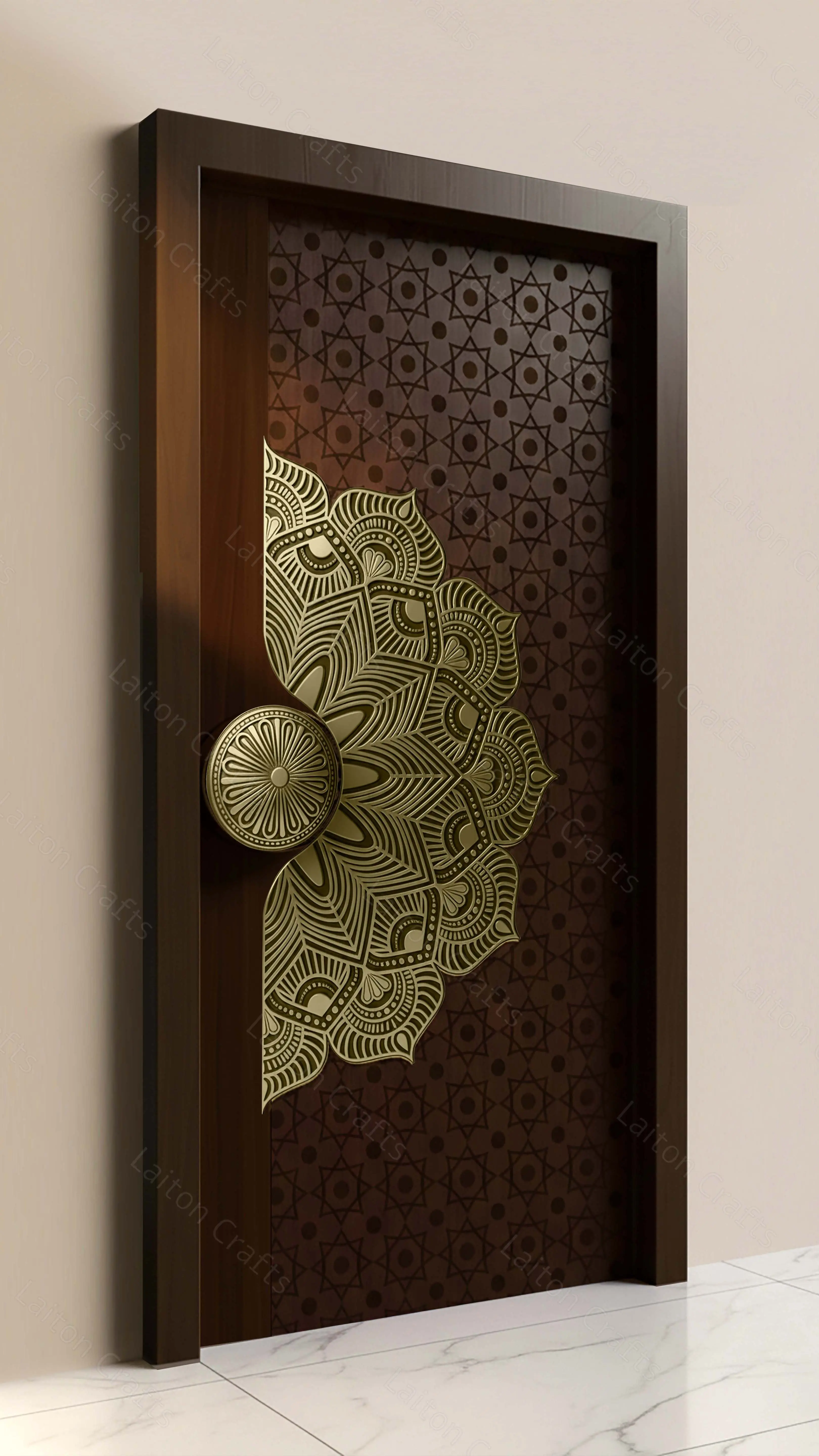 A striking brass decorative composition featuring an intricately detailed half-round mandala pattern that gracefully emerges across the door surface. The ornamental geometry forms a balanced semi-circular arrangement, creating depth and a strong visual focal point. The intricate craftsmanship reflects traditional design influences while maintaining a refined architectural presence. Finished in antique brass, the artwork adds richness and elegance, making it ideal for luxury entrance doors and premium architectural feature applications.